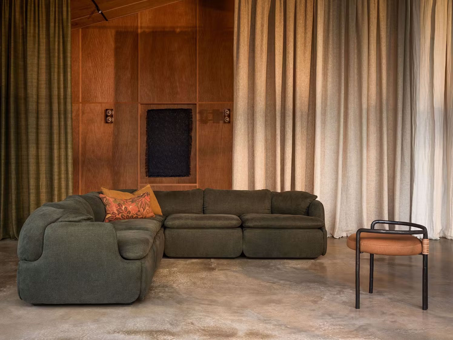 斬新なデザインと色合いの生地は、コンクリート素材やブラックアイアンなどの硬く重厚なインダストリアルテイストのインテリアにも溶け込みます。