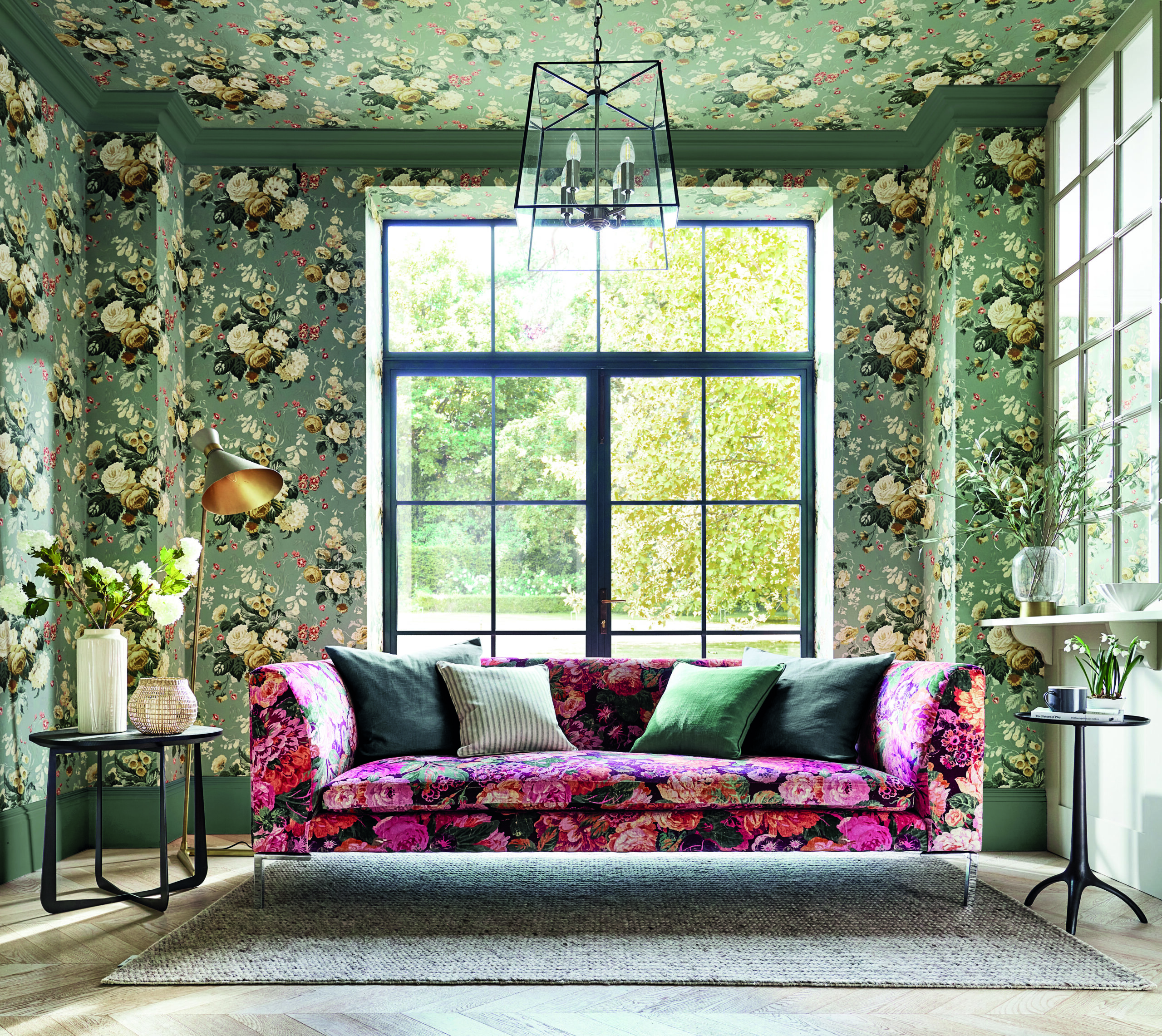 イギリスの田園風景を思わせる花柄をプリントした伝統を受け継ぐデザインと、そこに今日のモダンエッセンスを加えたファブリック