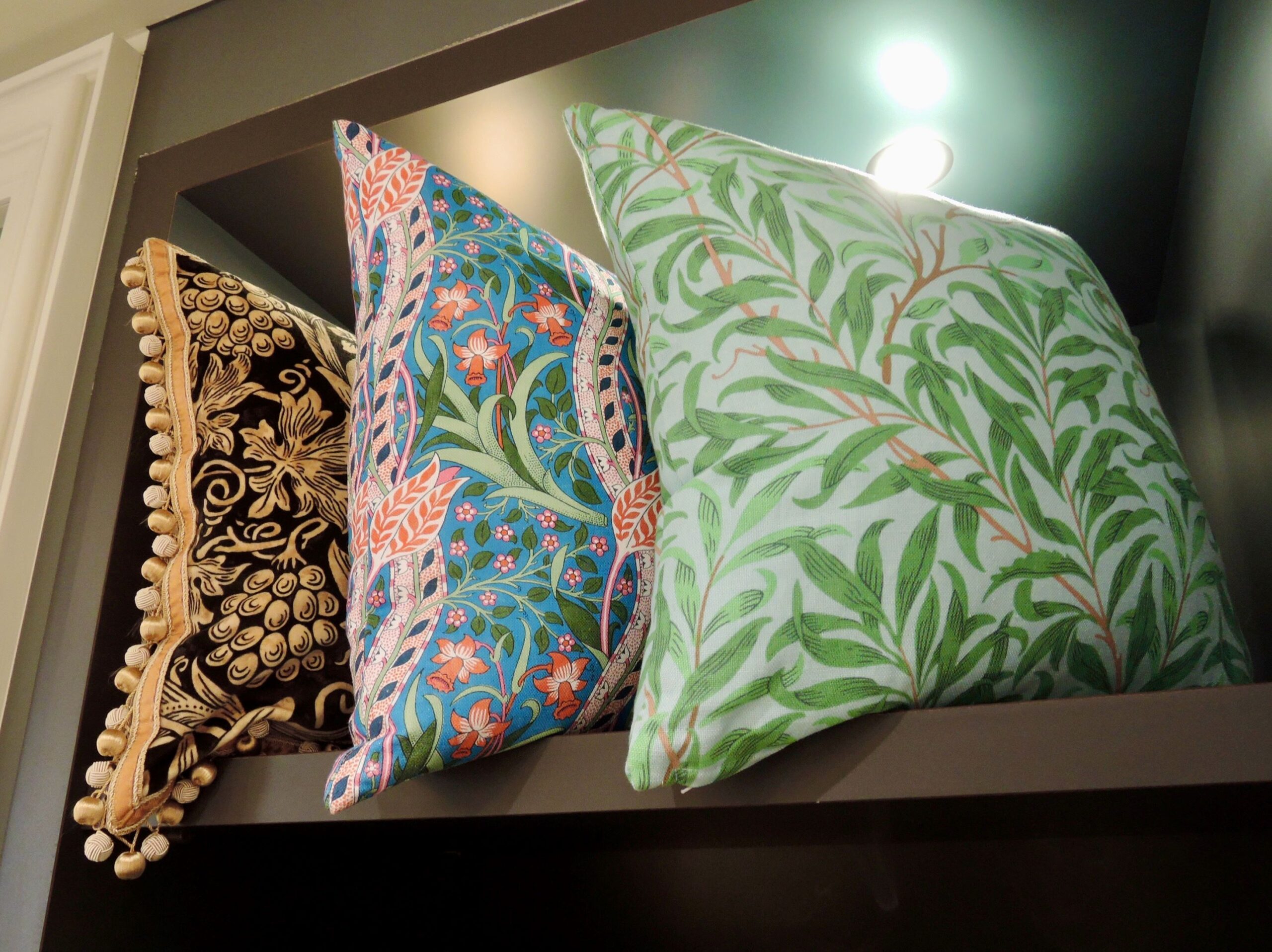 1つ置くだけでも空間のポイントになる柄ゆきが特徴のウィリアム・モリス。動物柄を使うとちょっと可哀想なところで模様が切れてしまうこともあるので、クッションに向くのは総柄、もしくは植物柄です。