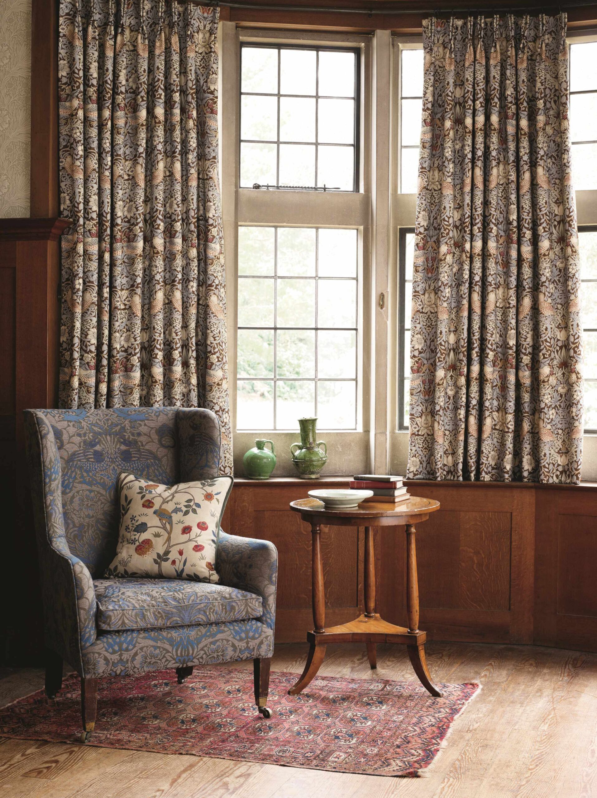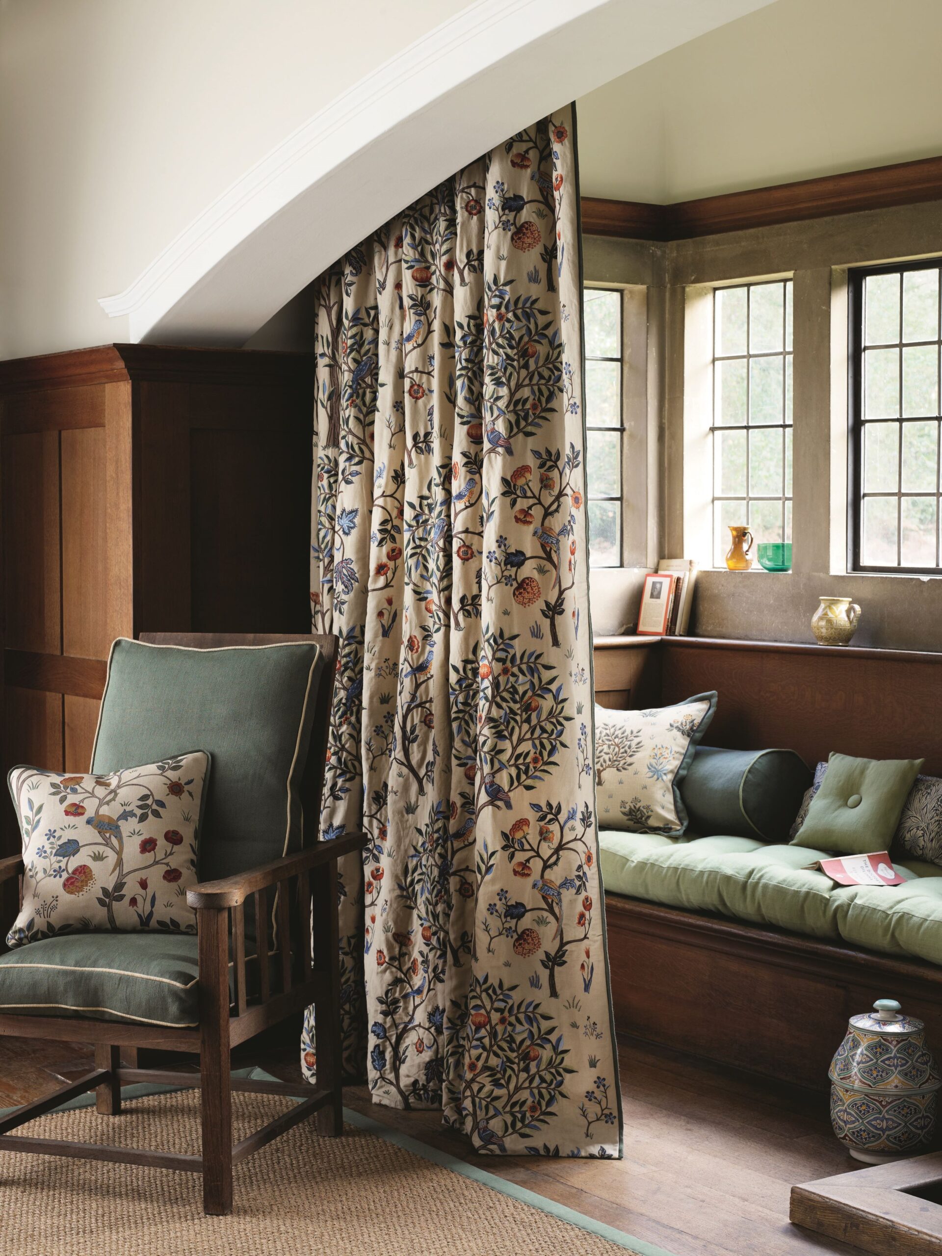 人気柄『ケルムスコットツリー』のカーテンで仕切られたインテリア