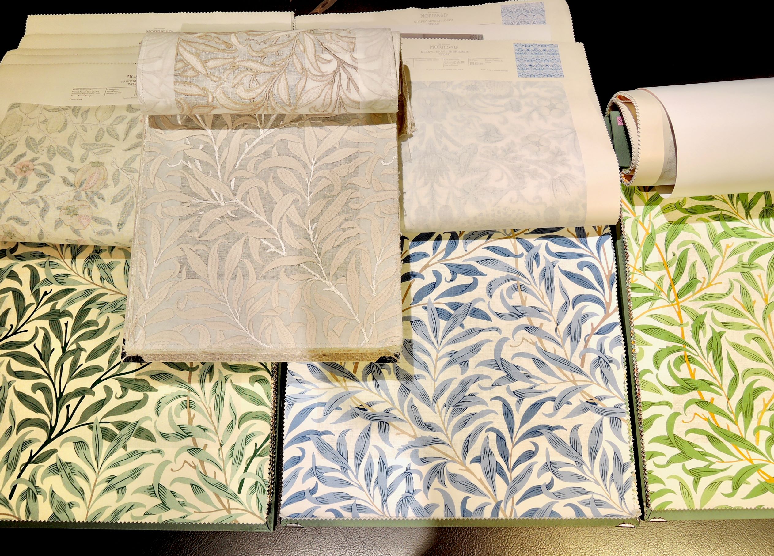 「ウィリアム・モリス」は、サンクリドー世田谷店でも横浜店でもご覧いただけます。もし柄も色味も何から取り入れればいいのか迷われていたとしても大丈夫。どのようなインテリアを作りたいのか等ヒアリングしながら、頭の中に描かれているイメージをご自宅の空間で具現化する方法をご提案することも可能です。自社縫製工場ではモリスの美しいデザインがより映えるよう、生地の柄出しにもこだわって仕立てています。もちろん現場の採寸や施工もお任せください。