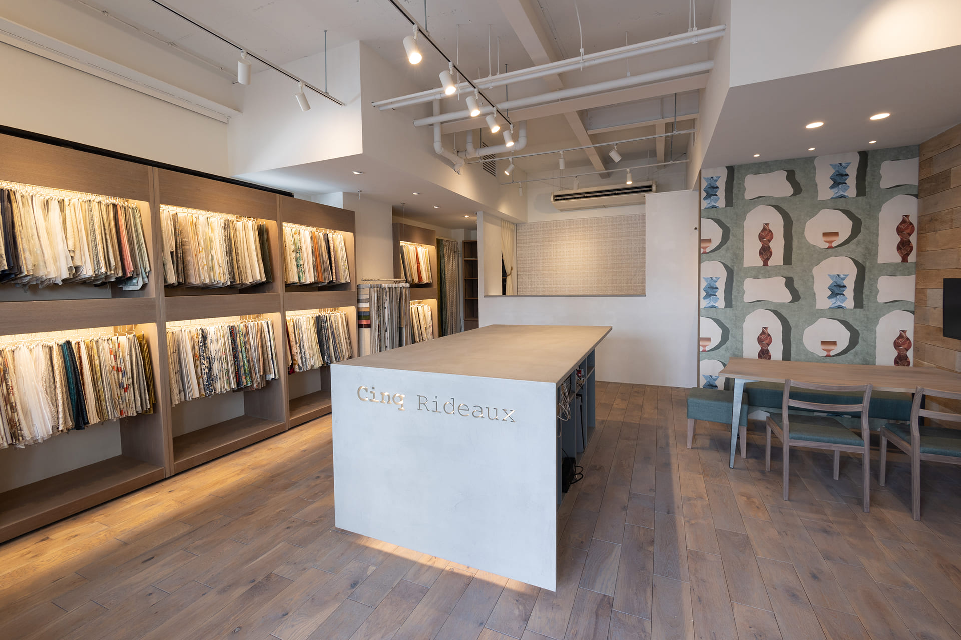 カーテン生地の輸入、オーダーカーテン製作・販売、カーテンレール取り付け工事、インテリアコーディネート全般、輸入クロス、国産クロスの販売・施工、家具販売、照明器具の販売・取り付け