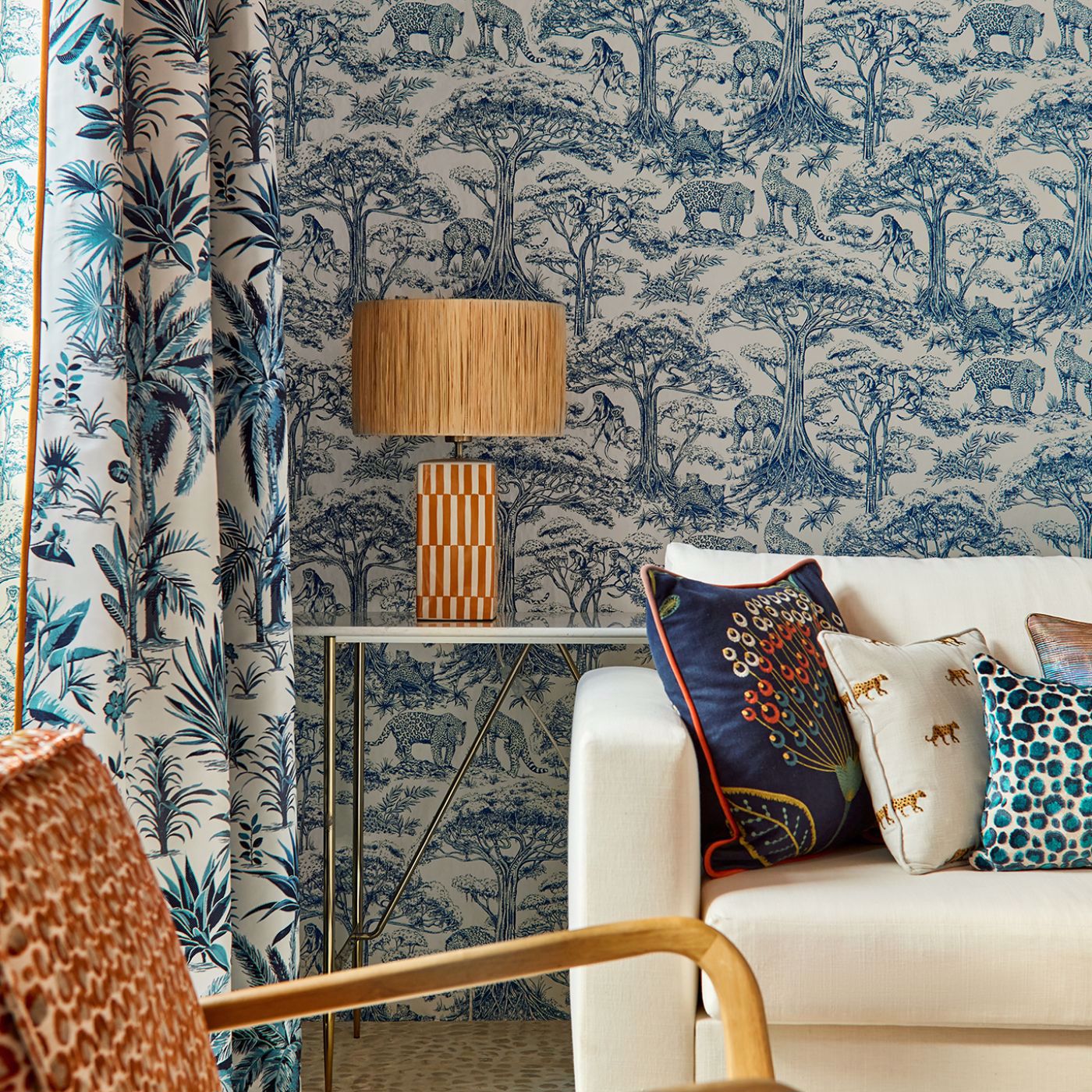 ボタニカルプリントなどの伝統的なイギリスらしいデザインに加えて、多様な文化や世界観にインスパイアされたコレクションを多く発表している点にClarke&Clarkeの特徴があります。例えば、少し風変りでありながらも、生き生きとしてキッチュな動物柄や、大胆な色彩のエキゾチックな植物柄。このようなデザインは、フラットカーテンやプレーンシェードにおすすめです。自分だけのこだわりを持っている方や、他人と異なる、個性的なオーダーカーテンを作りたいという方には、特にピッタリのブランドです。